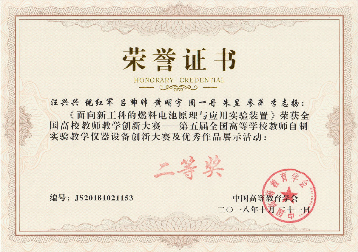 经教育部批准,中国高等教育博览会(2018·秋)于2018年10月19-21日在成都世纪城新国际会展中心隆重举行。倪红军院长带领我院教师学生代表参加活动,选送的“面向新工科的燃料电池原理与应用实验装置”(完成人:汪兴兴、倪红军、吕帅帅、黄明宇、周一丹、朱昱、廖萍、李志扬)作品荣获第五届全国高等学校教师自制实验教学仪器设备创新大赛二等奖。