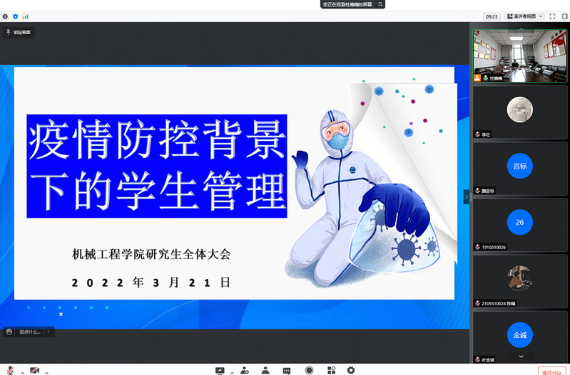 研究生辅导员杜楠楠主持会议,并对全体研究生提出晨午检制度、每日健康打卡以及疫情摸排等常规性工作的要求。学工办主任拜文萍强调了坚守做人底线、坚决不触犯法律底线的要求,呼吁人人争做平安守护者,共同打赢疫情防控阻击战。